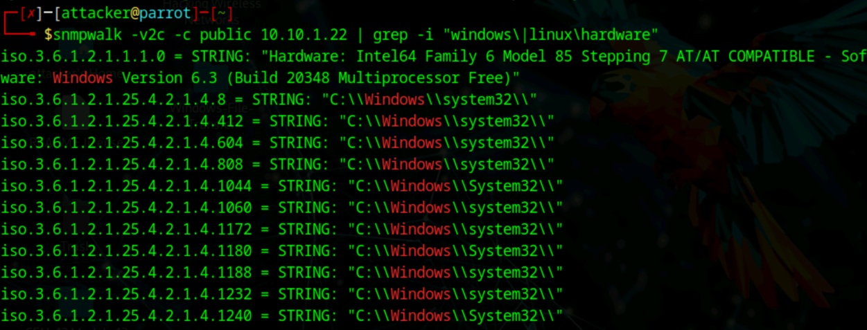 snmpwalk -v1 -c public 10.10.1.22 | grep -i "windows\|linux\|hardware"